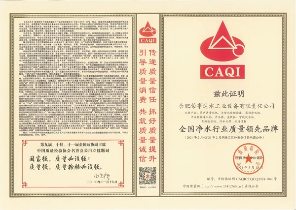 傳遞質量信任,引導質量消費。 在由中國質量檢驗協會主辦的2024年“3·15”產品和服務質量誠信承諾的主題活動中,榮事達水工業公司憑借卓越的產品品質及良好的社會形象,獲得協會以及權威專家的一致認可,榮膺 “全國產品和服務質量誠信示范企業 ”“全國凈水行業質量領先企業”“全國凈水行業質量領先品牌”“全國產品和服務質量誠信品牌”“全國質量檢驗穩定合格產品”“全國質量檢驗信譽保障產品”“全國消費者質量信譽保障產品 ”多項榮譽。