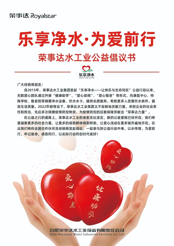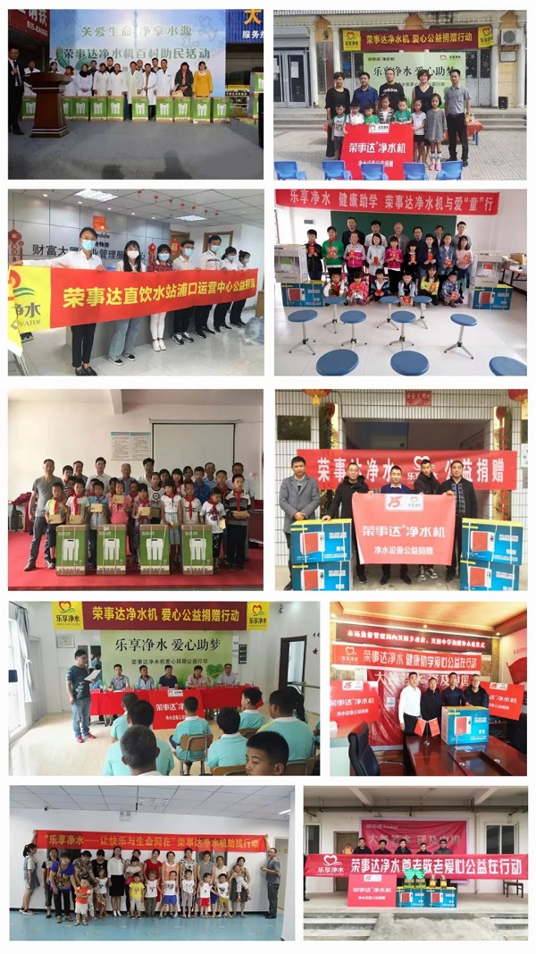 榮事達水工業經銷商積極響應集團公益倡議,熱衷于健康助學、愛心敬老、愛心助殘、疫情防控等多種形式的公益行動,截止到目前,經銷商們的公益活動已遍及安徽、南京、湖南、江蘇、陜西、江西、河南、河北等多個地區,以健康好水,溫暖每一個城市。